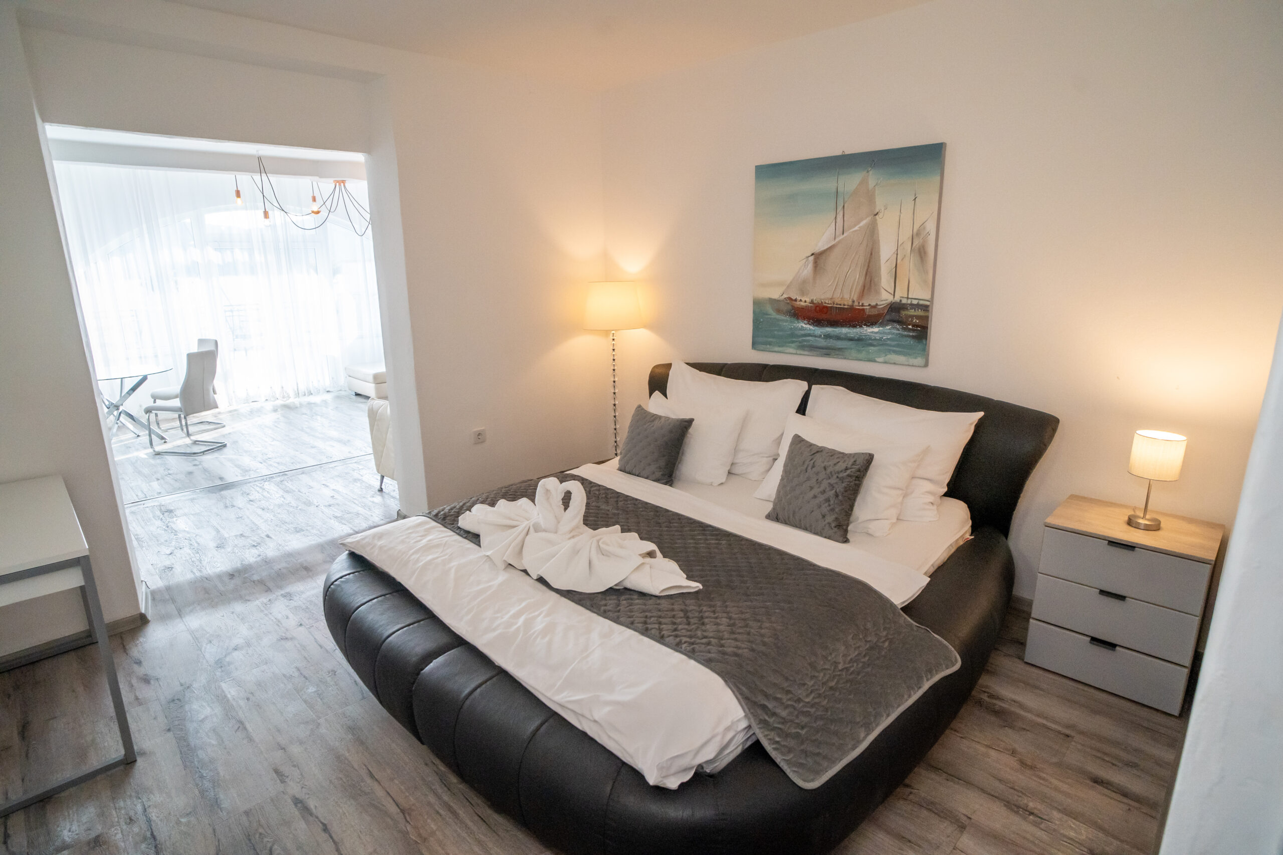 Inside the suite, you will find a generous open-plan layout featuring a full-size, fully equipped kitchen, a cozy living area with a leather sofa, and a bedroom with a king-size bed, visually separated to ensure privacy. Elegant furnishings and abundant natural light create a sophisticated yet welcoming atmosphere, seamlessly blending indoor comfort with outdoor luxury.